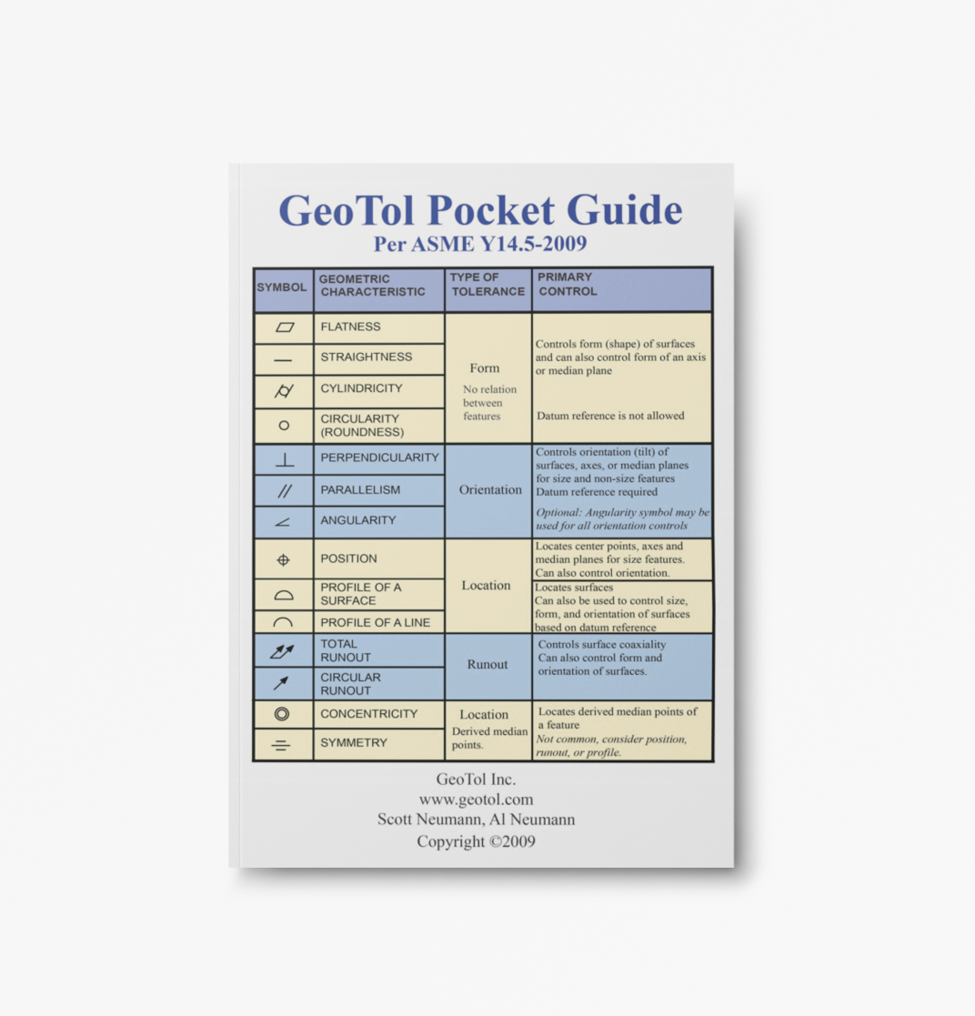 The GeoTol Pro 2009 Pocket Guide is a handy pocket reference consisting of 80 pages with full color graphics, GD&T symbols, formulas and tables. It is written in an easy to understand language that progresses through the concepts from basic to advanced. It is an abridged version of the GeoTol Pro 2009 Workbook, containing everything you would need to quickly reference in the field or at your desk.